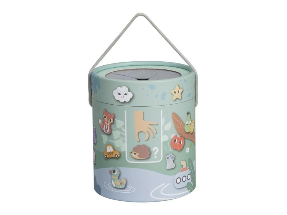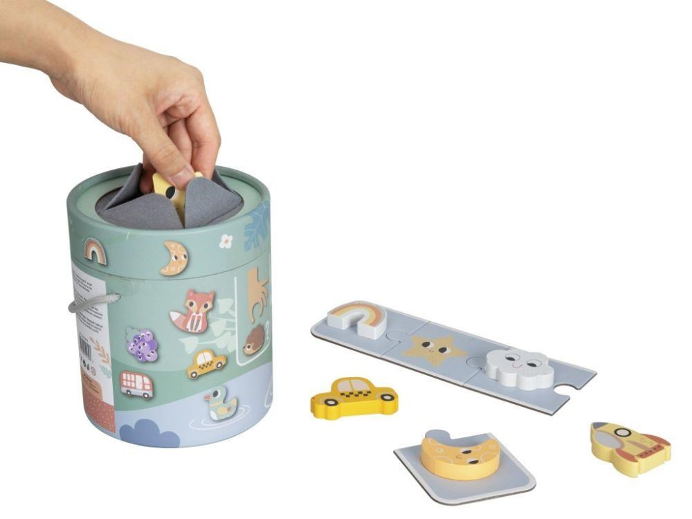 Společenská hra pro děti i celou rodinu Hmatej a najdi nabízí spoustu zábavy a možností ke hře. Hra, která dokonale potrénuje a zdokonalí motorické dovednosti, spočívá v hledání správného dřevěného předmětu v kyblíku, kdy pouze hmatem musí hráč najít požadovaný tvar. Hru můžete hrát různým způsobem a přizpůsobit ji věku i dovednostem každého hráče. Užijte si společné chvíle při hmatání a hledání zvířátek, dopravních prostředků a dalších tvarů..