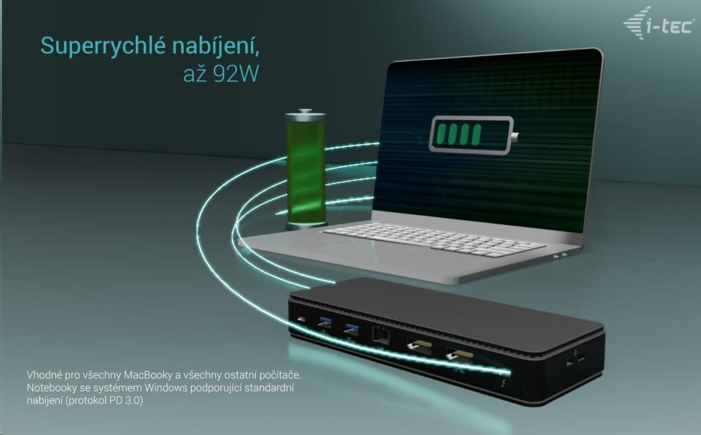 - Poskytuje až 92W Power Delivery pro kompatibilní notebooky a tablety s rozhraním USB4, USB-C a Thunderbolt. Hostitelské zařízení musí podporovat USB-C Power Delivery.
