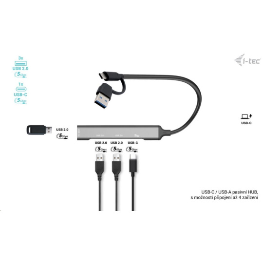 - Univerzální pasivní HUB USB-C/USB-A umožňuje připojit až 4 zařízení.