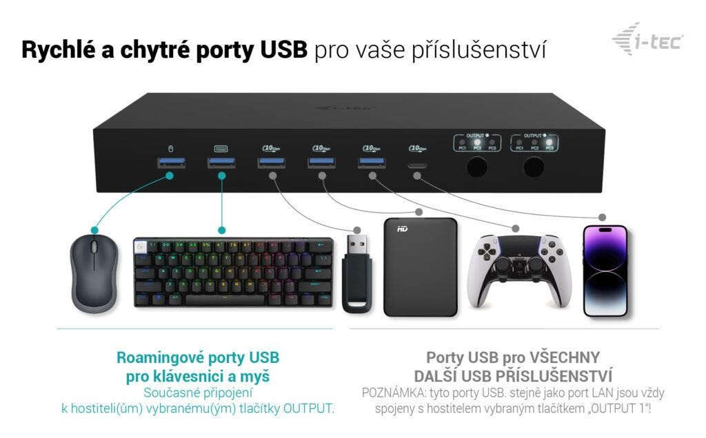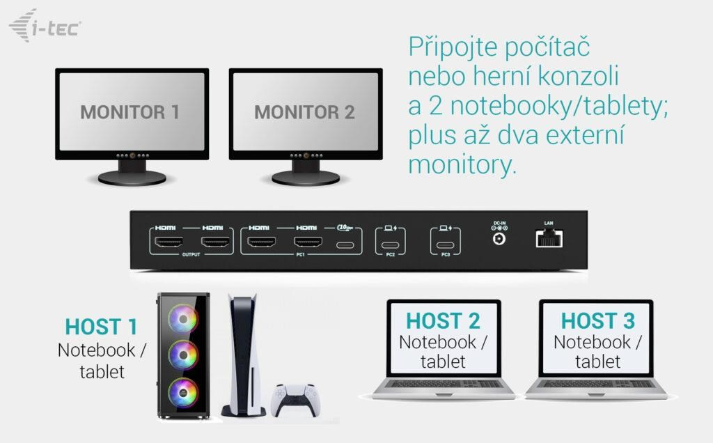 • Podpora až 3 hostitelských zařízení (2× notebook/tablet + 1× herní konzole/PC)