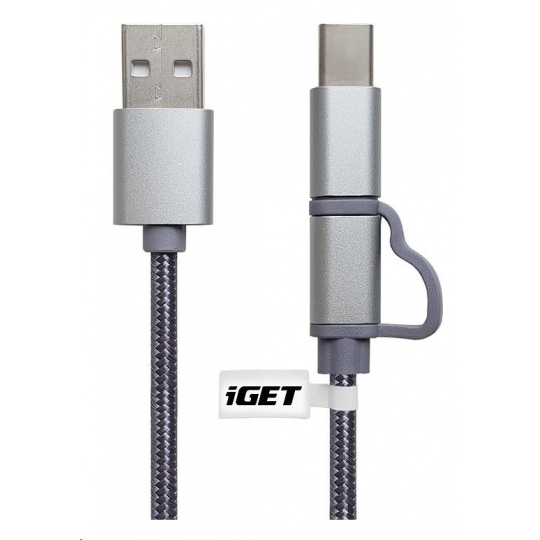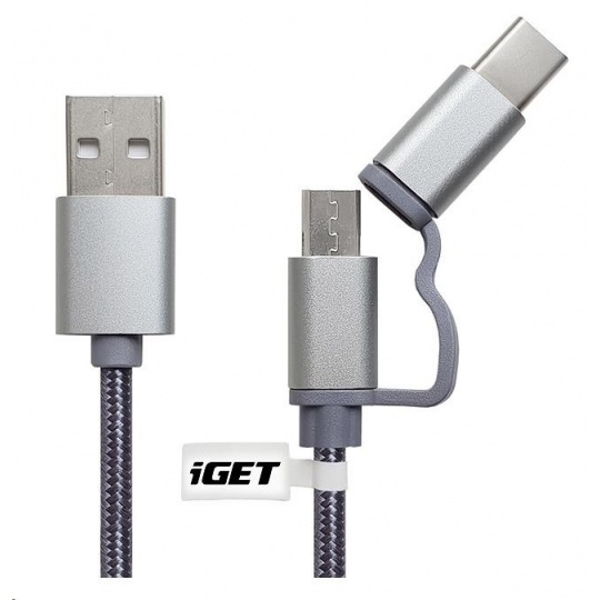 iGET G2V1 USB kabel 2v1, 1m, stříbrný, microUSB i USB-C, prodloužené koncovky