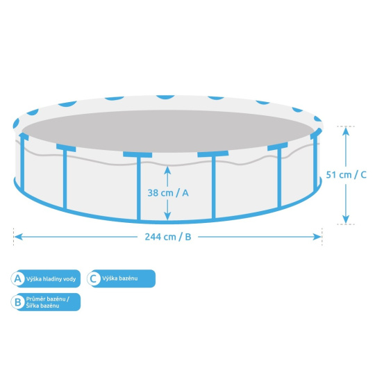 Uvedené rozměry bazénu jsou pouze orientační a ovlivnit je může rovnost podkladu či objem napuštěné vody. Povolená výrobní odchylka je 5 %.