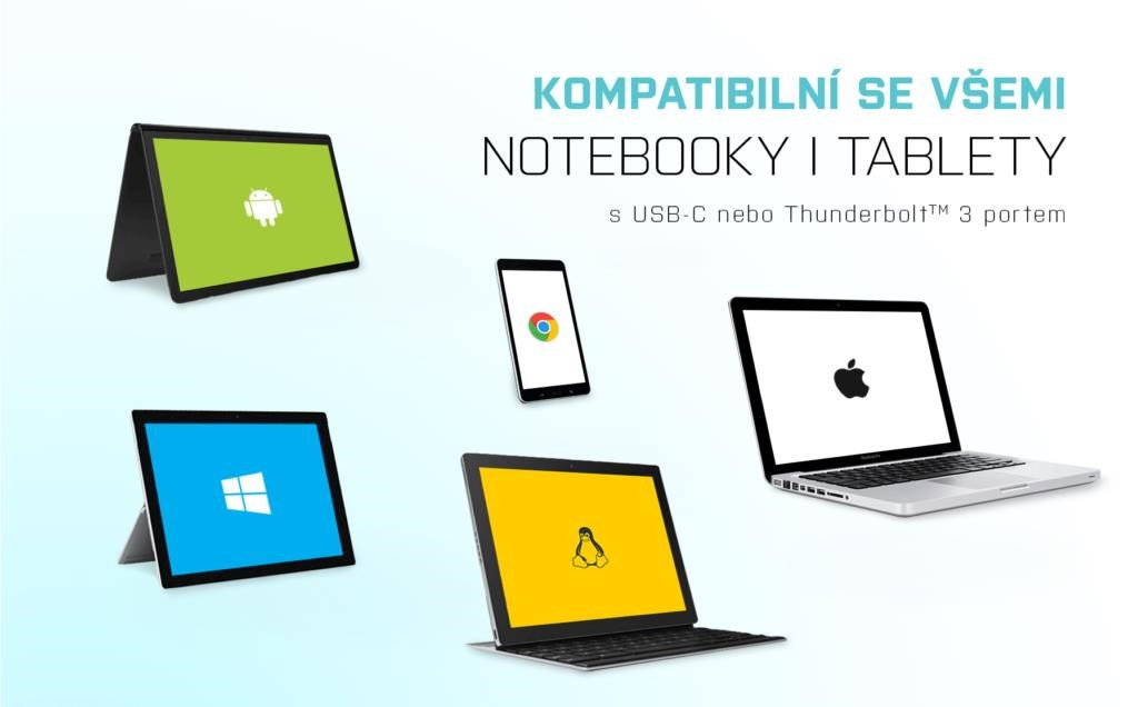 • 1x USB-C 3.1 nebo Thunderbolt 3 konektor, přenosová rychlost až 10 Gbps (USB-C), resp. 40Gbps (Thunderbolt 3), pro připojení adaptéru k notebooku, tabletu nebo PC