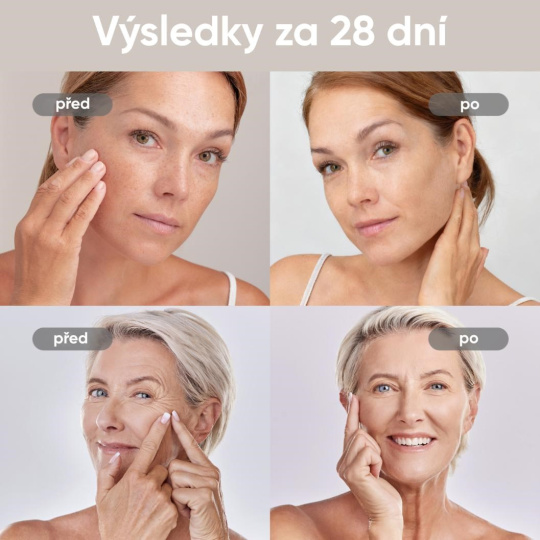 - Viditelné výsledky za 28 dní – klinicky ověřený účinek. Testy prokázaly redukování vrásek o 20 %, zlepšení jasu pleti o 24 %, zvýšení pevnosti o 16 % a redukci tmavých skvrn o téměř 30 % již po čtyřech týdnech pravidelného používání.