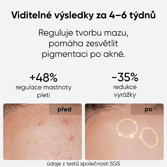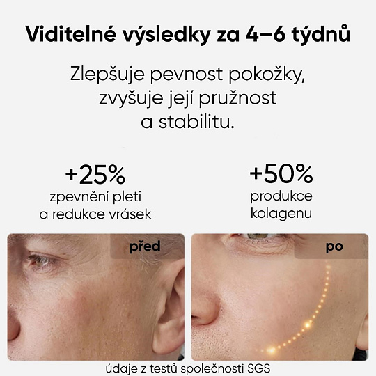 - Viditelné výsledky za 4-6 týdnů: Pravidelné používání prokazatelně redukuje akné, vrásky, pigmentaci a zlepšuje elasticitu pleti.