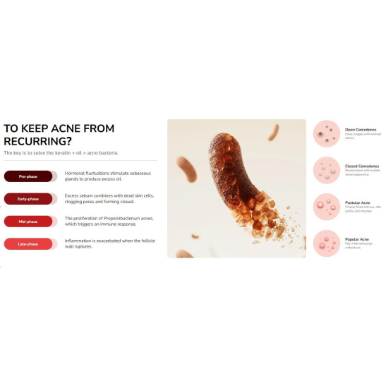 • Prevence návratu akné: Cíleným působením na příčinu vzniku akné (bakterie a maz) efektivně snižuje riziko jeho opakovaného výskytu.