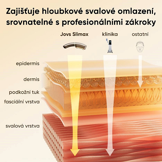 Většina kosmetických přístrojů se zaměřuje pouze na dermis, tedy na pokožku. Stárnutí však začíná hlouběji. Pokud svaly pod kůží ztratí svou pevnost, pokožka přijde o svou oporu a začne ochabovat a klesat – bez ohledu na to, kolik kolagenu obsahuje. JOVS Slimax jako jediný využívá technologii elektrických pulzních vln CET (Collagen Electrophoretic Techniques), která vysílá signály přímo do svalové vrstvy, stimuluje jejich aktivitu a obnovuje tak pevný základ celé tváře.