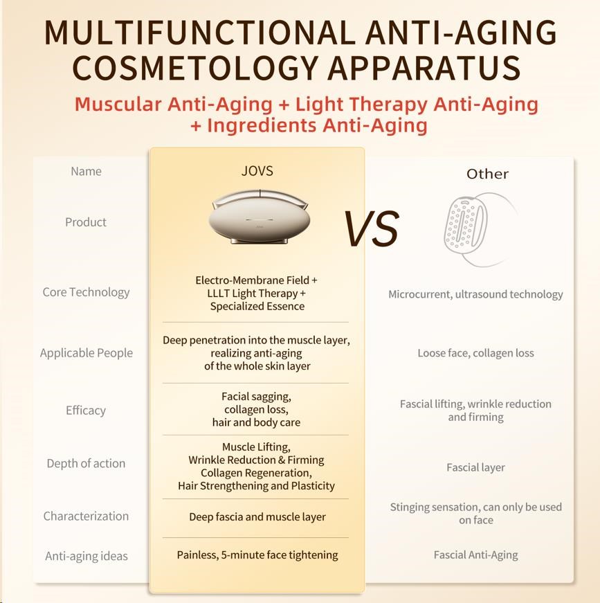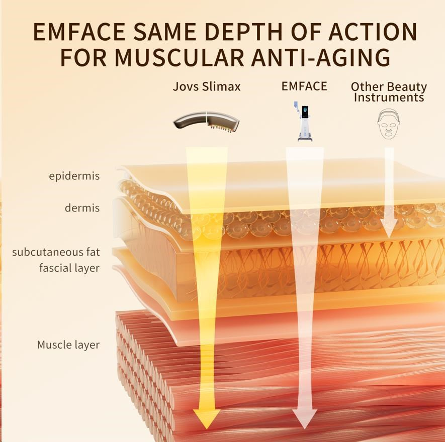 Většina kosmetických přístrojů se zaměřuje pouze na dermis, tedy na pokožku. Stárnutí však začíná hlouběji. Pokud svaly pod kůží ztratí svou pevnost, pokožka přijde o svou oporu a začne ochabovat a klesat – bez ohledu na to, kolik kolagenu obsahuje. JOVS Slimax jako jediný využívá technologii elektrických pulzních vln CET (Collagen Electrophoretic Techniques), která vysílá signály přímo do svalové vrstvy, stimuluje jejich aktivitu a obnovuje tak pevný základ celé tváře.