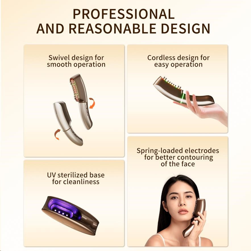 - Revoluční technologie CET: Unikátní elektrické pulzní vlny, které působí přímo na svalovou vrstvu pro maximální liftingový efekt – mnohem účinnější než běžný EMS mikroproud.