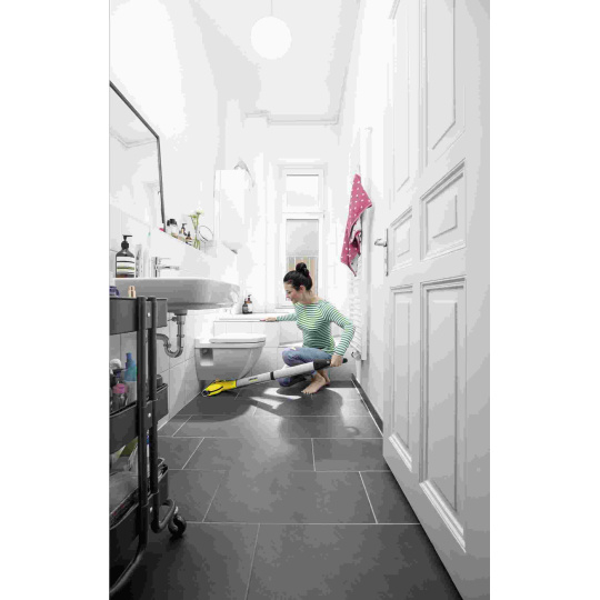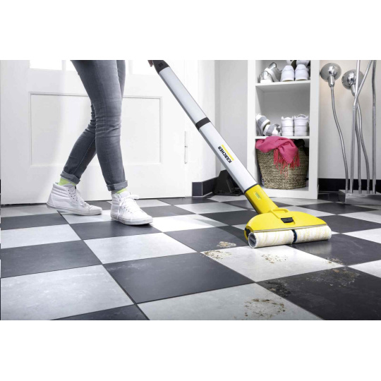 Vytírat stále čistou vodou? Bateriová podlahová myčka FC 3 Cordless se o to postará. Nečistoty jsou schromažďovány v nádobkách umístěných za válci. Rotující válce neustále zvlhčuje čistá voda, zatímco se vytřené nečistoty dostanou do nádrže špinavé vody. Podlahy jsou tak o 20 procent čistší než při použití běžného mopu. Štíhlá konstrukce myčky FC 3 Cordless zajišťuje bezproblémovou práci i pod nábytkem i její pohodlné uložení bez velkých nároků na místo. Otočný kloub se postará o bezproblémové čištění krajů i rohů. Čas potřebný pro uschnutí podlahy činí pouze cca 2 minuty, čímž je možné tuto myčku používat zcela bez starostí i na tvrdé podlahy (např. i na parkety). Výkonná lithium-ionová baterie poskytuje maximální volnost pohybu, jelikož lze vytírat zcela nezávisle na zásuvkách. A intuitivní LED kontrolka průběžně informuje o stavu baterie.
