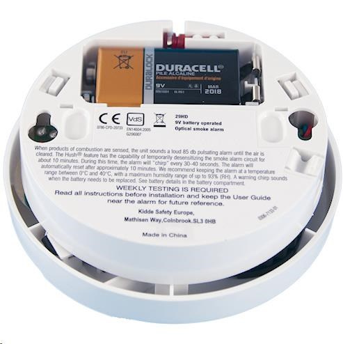 Hlásič požáru je vybaven testovacím tlačítkem TEST pro kontrolu správného fungování zařízení a HUSH pro přechodné umlčení požárního hlásiče pro případ planého alarmu. Stisknutí tlačítka způsobí okamžitou deaktivaci alarmu, na dobu asi 10minut, snížení citlivosti obvodů a vypnutí akustické signalizace hlásiče. Tlačítko HUSH používejte pouze tehdy, pakliže znáte příčinu aktivace hlásiče (např. při vaření nebo smažení). Po cca 10 minutách od deaktivace hlásiče se tento zcela automaticky resetuje do původního nastavení pro monitorování nebezpečí požáru. Pokud v místnosti zůstane vysoká koncentrace kouře, můžete stisknout tlačítko HUSH opakovaně a to až do okamžiku kdy je místnost řádně odvětrána. Tento model je vybaven nejmodernějším fotoelektrickým senzorem Kidde.