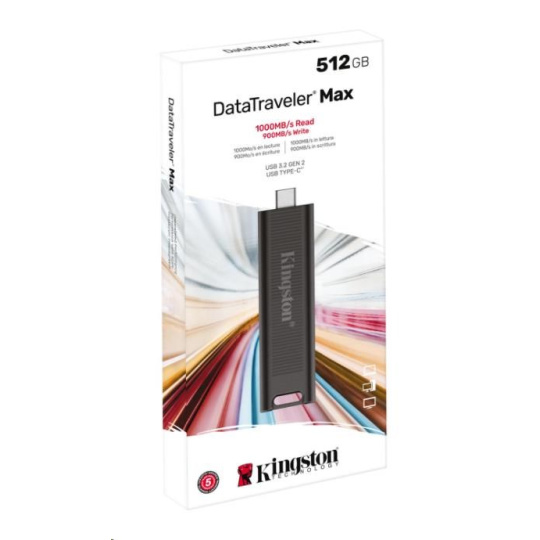 DataTraveler® Max značky Kingston je vysoce výkonný flash disk USB Type-C®1, který využívá nejnovější standard rozhraní USB 3.2 2. generace pro rekordní rychlost čtení/zápisu až 1000/900 MB/s2. Jedinečné pouzdro s prolisem, navržené s ohledem na přenosnost a pohodlí, chrání konektor, když ho nepoužíváte, a lze ho snadno přesunout jediným pohybem. DT Max nabízí špičkový výkon a rozšířené kapacity až 1 TB3, což z něj činí ideální řešení pro přenos a ukládání velkých digitálních souborů, jako jsou fotografie v rozlišení HD, videa v rozlišení 4K/8K, hudba a další.