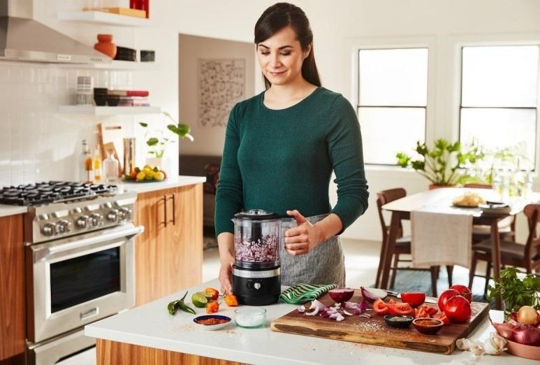 Hledáte praktického pomocníka do vaší kuchyně? Vsaďte na poctivou přípravu, která vede k těm nejlepším a nejchutnějším výsledkům. Kuchyňský robot KitchenAid 5KFCB519EBM je bezdrátový model food processoru, který se stane nepostradatelnou součástí vaší kuchyně. Zrychlí a zefektivní ty činnosti, které při přípravě jídel zabírají spoustu času. Pracovní nádoba o objemu 1,18 l je opatřena víkem s otvorem, kterým lze postupně přidávat ingredience bez nutnosti zastavení provozu. Požadovaných výsledků dosáhnete díky dvěma rychlostem a pulzní funkci, počet otáček je v rozmezí 2 600 až 3 500 ot./min. Velkou přednostní food processoru jsou také kompaktní rozměry a nízká hmotnost, představuje perfektní řešení i do malých domácností. Pokud chcete volně tvořit bez omezování přívodním kabelem, je pro vás tato pomocná síla jako dělaná.