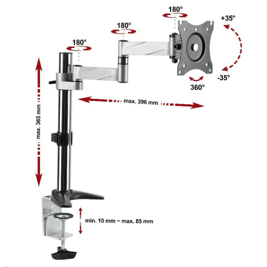 Technické údaje: nosnost 8kg plně nastavelný - 3D polohování monitoru na monitory s úhlopříčkou 13" až 27" podpora VESA 75x75 a 100x100 otáčení do stran +/- 180° náklon +/- 35° rotace obrazovky +/- 180° - funkce PIVOT nastavení vzdálenosti od nosníku 0mm až 396mm nastavení výšky max. 364mm uchycení na stolové desky o průměru 10mm až 85mm dva typy uchycení na stolové desky - svěrák na okraj stolu nebo skrz desku kamkoliv do prostoru krásný vzhled - chromový nosník, ramena ve stříbrném provedení materiál hliník vynikající kvalita, spolehlivost a dlouhá životnost instalační materiál součástí balení záruka 3 roky.