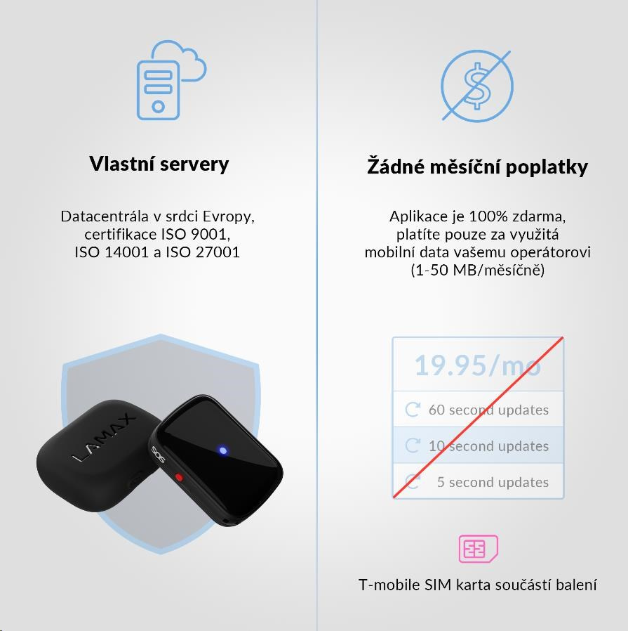 SOS tlačítko vám umožní ihned se spojit s kontakty, které si nastavíte. LAMAX GPS Locator v sobě má mikrofon i reproduktor, takže můžete normálně mluvit a popsat svou situaci. Záležet jsme si dali i na zabezpečení dat. V mobilní aplikaci LAMAX Tracking si můžete prohlédnout až 30 denní historii nasbíraných dat nebo si projít posledních 24 hodin minutu po minutě. Snadno tak zjistíte, kde všude bylo vaše auto, nebo co dělá pes, když zrovna nejste doma. Protože jde o citlivé informace, spustili jsme vlastní servery, kde budou naprosto v bezpečí.