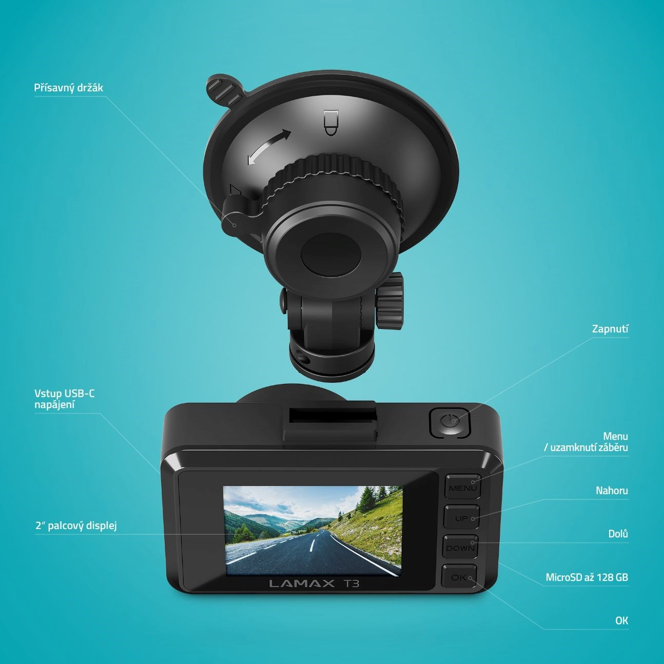 V jednoduchosti je krása, proto design i ovládání autokamery jsou přesně takové. České menu je navíc dokonale přehledné a zobrazí se ti na 2” displeji, který má i vychytaný spořič. Kameru propojíš prostřednictvím moderního USB-C konektoru a v její výbavě nechybí ani praktický přísavný držák, aby držela, kde má.