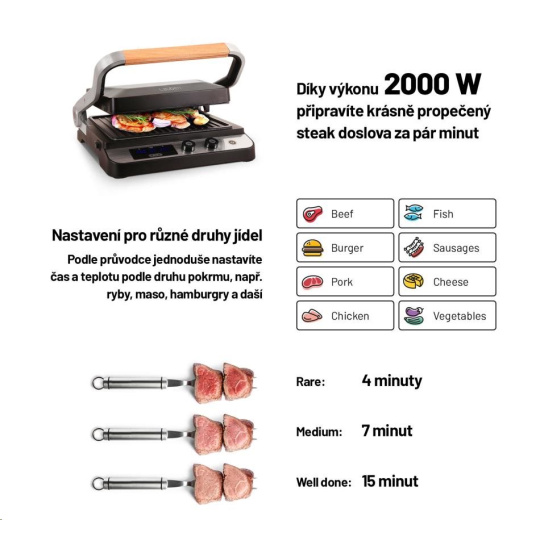 Gril se díky výkonu 2000 W rozehřeje velmi rychle a poradí si i se steaky, které vyžadují prudké opečení při vysoké teplotě.