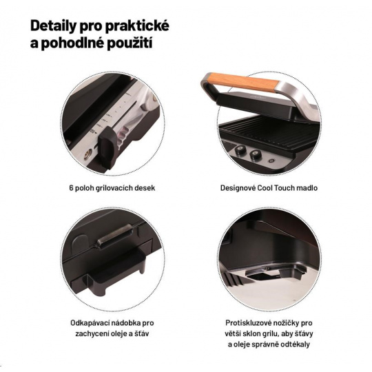 K manipulaci s grilem slouží designové madlo v dřevěném vzhledu s funkcí Cool Touch.