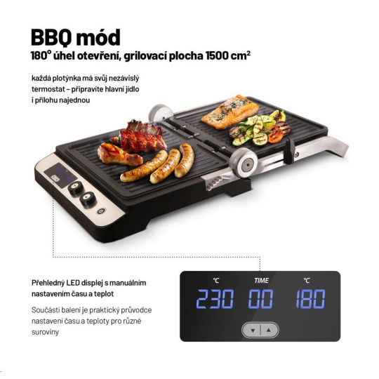 Plotýnky grilu mají nastavitelnou polohu. Můžete například upravit výšku a sklon plotýnky tak, aby se snížil tlak působící na křehké suroviny, jako jsou třeba čerstvé ryby. V BBQ módu si u každé z plotýnek můžete nastavit požadovanou teplotu ohřevu separátně. Se správnou volbou teploty pro jednotlivé druhy potravin vám pomůže přiložený průvodce. Zároveň si pro každý pokrm můžete nastavit požadovaný čas přípravy, takže se nemusíte bát, že netrefíte správný stupeň propečení. Gril je vybaven i funkcí automatického vypnutí, díky vysokému výkonu se velmi rychle rozehřeje a o průběhu přípravy máte přehled díky LED displeji. V nabídce jsou i ploché plotýnky pro ještě širší možnosti grilu.