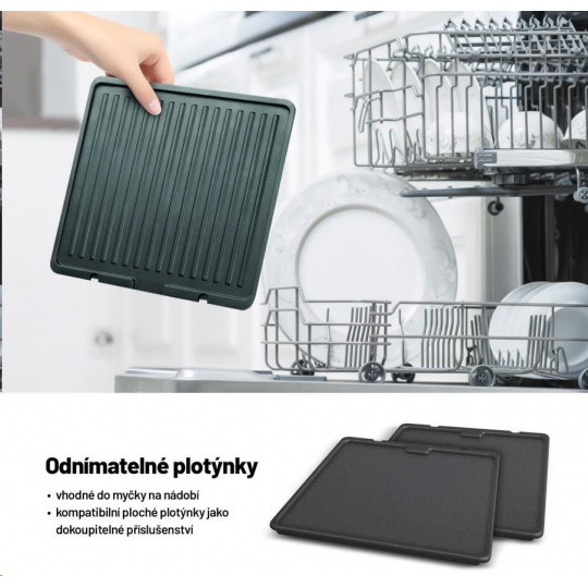 Obě grilovací plotýnky jsou odnímatelné a vhodné do myčky nádobí.