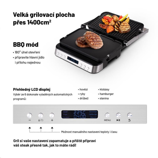 Gril nabízí 6 automatických programů, které jsou na míru ušité různým surovinám. Teplotu i čas přípravy můžete nastavit také manuálně, gril si vaší volbu zapamatuje a můžete ji využít i příště.