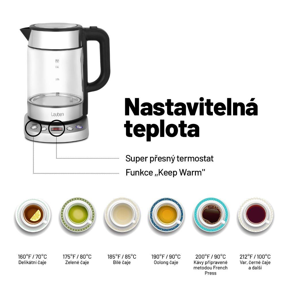 Jste-li milovníkem čaje, jistě víte, že každý druh potřebuje speciální zacházení, tedy jinak horkou vodu. S Lauben Electric Kettle si díky integrovanému termostatu nastavíte teplotu přesně tak, jak potřebujete. Teplotu volíte v rozmezí 60-100 °C, po desetistupňových intervalech – můžete si ji tedy nastavit zcela tak, jak potřebujete, netřeba se spoléhat na přednastavené stupně. Kromě kávy a čajů všech druhů tak s konvicí Lauben ohřejete vodu třeba i do dětské kaše, kam potřebujete vodu nižší teploty.