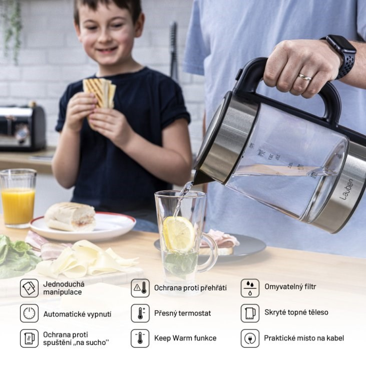 Teplotu volíte v rozmezí 60-100 °C po desetistupňových intervalech. V konvici Lauben ohřejete až 1,7 l vody naráz. Její aktuální množství vždy poznáte díky stupnici na skle. Víko konvice je opatřeno bezpečnostní pojistkou proti rozlití a otevíráte jej snadno, pomocí tlačítka umístěného na držadle.
