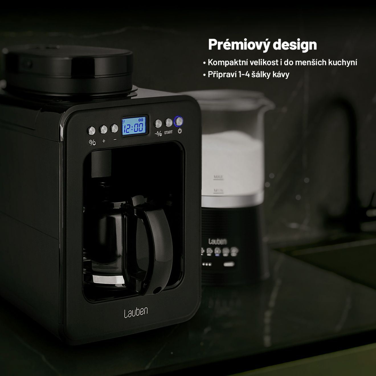 Překapávaná káva jako z kavárnyDopřejte si každý den klidnou chvilku se šálkem lahodné překapávané kávy. Kávovar Lauben Grind&Drip Coffee Maker 600BB ji připraví během chvilky z čerstvě namletých zrn díky zabudovanému mlýnku. Nepotřebujete tak další příslušenství, odpadá i přesýpání kávy z mlýnku. Ač umí připravit také kávu z již namletých zrn, čerstvě umletá chutná nejlépe. Funkce Keep Warm navíc zajistí, že si nápoj užijete vždy horký. Vše potřebné nastavíte na přehledném digitálním displeji a pak už jen čekáte, než do skleněné konvice nakape černý mok. Čekání vás ušetří funkce časovače, která zajistí, že bude káva připravena na požadovanou dobu. Díky technologii Lauben AntiDrip® navíc umožňuje nalití kávy ještě před dokončením cyklu. Bezpečnost kávovaru prémiového kompaktního designu zajišťuje funkce automatického vypnutí a technologie Cool Touch. Čas uspoří snadná údržba, k níž přispívá také omyvatelný filtr z nerezové oceli. Není třeba stále dokupovat papírové jednorázové, takže šetří vaši peněženku a rovněž životní prostředí.