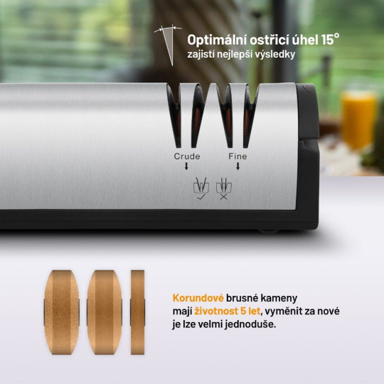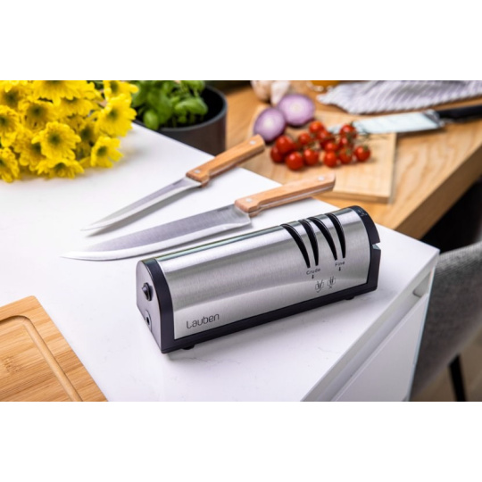 Vždy dobře nabroušené ostříDobře nabroušený nůž je základem kuchyně. Dnes už ale nemusíte hledat brusiče nožů, díky brusce na nože Lauben Knife Sharpener 4700SB jej budete mít stále po ruce. Bruska zvládne hrubé i hladké začištění a hodí se pro většinu nožů, sekáčků či nůžek. Kvalitní nabroušení zajišťuje optimální brusný úhel 15° a vodicí drážky pro udržení správného sklonu. Brusný kámen je v případě potřeby možné vyměnit, životnost je zhruba pět let. Bruska má ergonomický tvar, vyznačuje se tichým provozem a je vyrobena z nerezu, takže ji jen tak něco neublíží. Bezpečnost při provozu zajišťují protiskluzové nožičky.