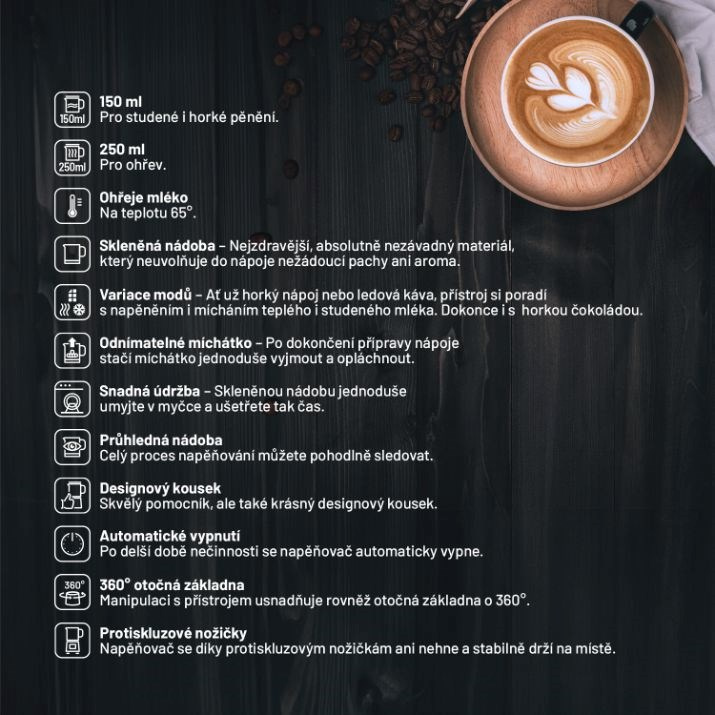 Tento stylový pomocník v sobě kombinuje neotřelý moderní design s praktickou stránkou. 360° otočná základna usnadňuje manipulaci s napěňovačem a postaráno je také o bezpečnost. Funkce automatického vypnutí zajistí, že po delší době nečinnosti se přístroj vypne, čímž dochází i k úspoře energie, protiskluzové nožičky mají pak za úkol udržet napěňovač vždy na svém místě.
