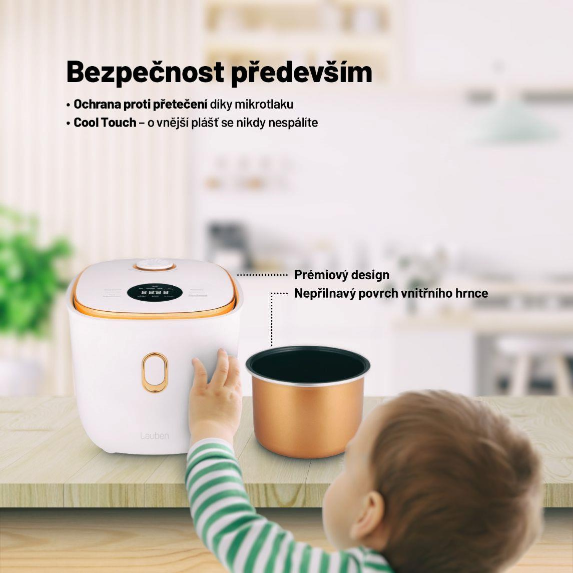 Vařte s lehkostí, chutně a stylověEfektivita, snadné použití a design mají společného jmenovatele, je jím víceúčelový rýžovar Lauben Multifunction Rice Cooker 1200WR Rose Gold Edition. Stiskem jediného tlačítka uvaří všechny druhy rýže na správnou tvrdost a 6 přednastavených funkcí vykouzlí další pokrmy jako kaše nebo polévky. Čas některých programů si však na intuitivním dotykovém displeji můžete nastavit i manuálně. Díky funkci odloženého startu lze mít jídlo připraveno už po návratu domů, opozdilci zase ocení funkci Keep Warm, která udrží pokrm teplý bez rozvaření. Porce nasytí jednotlivce i páry, jež pak mají více času pro sebe, protože ani údržba nezabere čas. Vnitřní hrnec lze dát do myčky. Bezpečné používání zajišťuje ochrana proti přetečení a technologie Cool Touch proti popálení. Rýžovar bude ozdobou každé kuchyně, kterou rozzáří trendy rose gold barvou, a přitom nezabere takřka žádné místo.