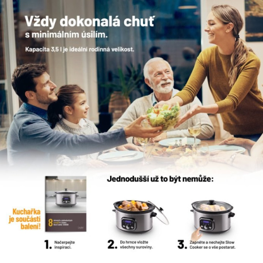 Šetřete vaši peněženku, ne vaše chuťové buňkyLauben Slow Cooker 3500SB je pomalý hrnec, se kterým ušetříte spoustu času a i z levnějších surovin vykouzlíte luxusní, šťavnaté pokrmy. Poradí si se všemi jídly, kde je ideální nižší teplotní stupeň a více času, jako jsou polévky, ragú nebo omáčky a to bez nutnosti vašeho zásahu. Vnitřní keramická nádoba o kapacitě 3,5 l perfektně drží teplo, nezanáší se, nikdy v ní nic nepřipálíte a lze mýt v myčce nádobí. Velikost je naprosto dostatečná pro velký rodinný oběd či sešlost s přáteli, ale díky kompaktnímu tvaru nezabírá zbytečně moc místa. Hrnec se snadno ovládá pomocí přehledného ovládacího panelu s tlačítky. Samozřejmostí je funkce odloženého startu nebo udržování teploty. Lauben Slow Cooker 3500SB je ideálním pomocníkem do kuchyně právě pro vás, pokud chcete mít na talíři vždy perfektní výsledek a nechce se vám obětovat hodiny strávené u sporáku. S pomalým hrncem Lauben snížíte vaše náklady, ne vaši laťku. A protože inspirace není nikdy dost, přidali jsme do balení i kuchařku s recepty!