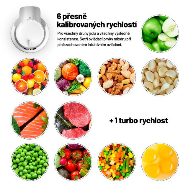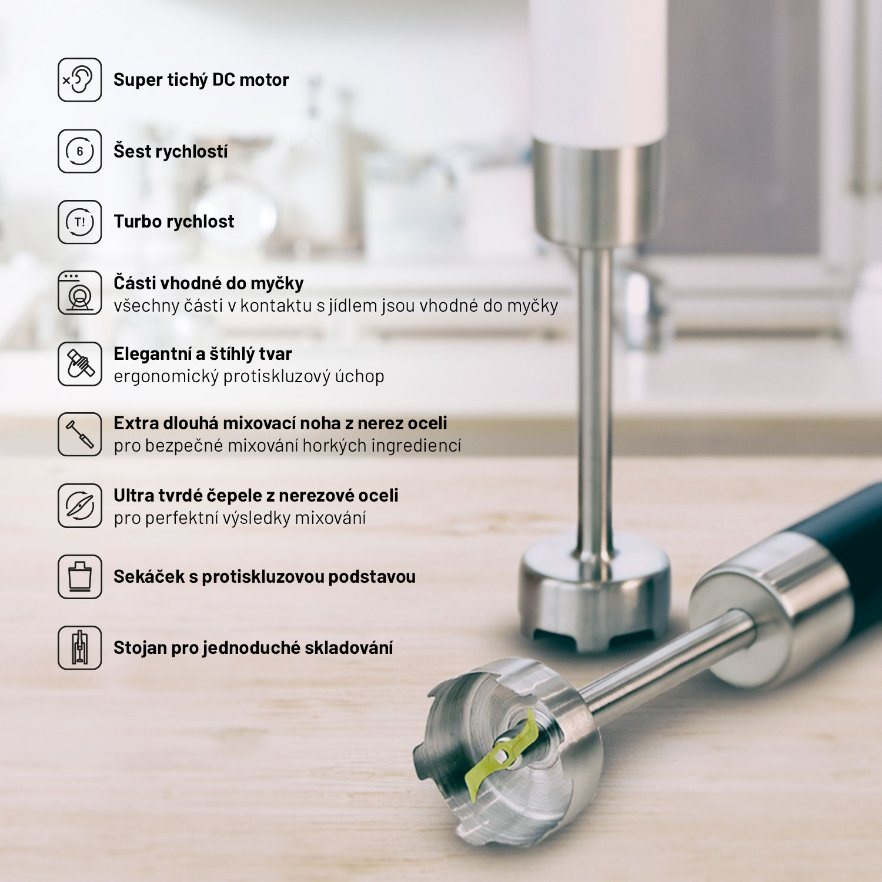 Ovládání tyčového mixéru zvládne úplně každý. Na výběr máte ze 6 rychlostí, samozřejmostí je i funkce TURBO. Mixovací nástavec má extra dlouhou nohu, takže můžete bez problému mixovat i horké ingredience. Všichni známe situaci, kdy mixované ingredience z nádoby vystříknou a vy nejenže přijdete o polévku k večeři, ale navíc můžete znovu malovat kuchyň. S naším mixérem se vám toto nestane, protože jsme hlavici vytvarovali tak, aby k nechtěnému rozstříknutí potravin nedošlo. V průběhu domácího večírku tedy nemusíte oblékat zástěru ani při výrobě koktejlů pro hosty. Jistě vás také potěší, že všechny nástavce lze mýt v myčce nádobí.