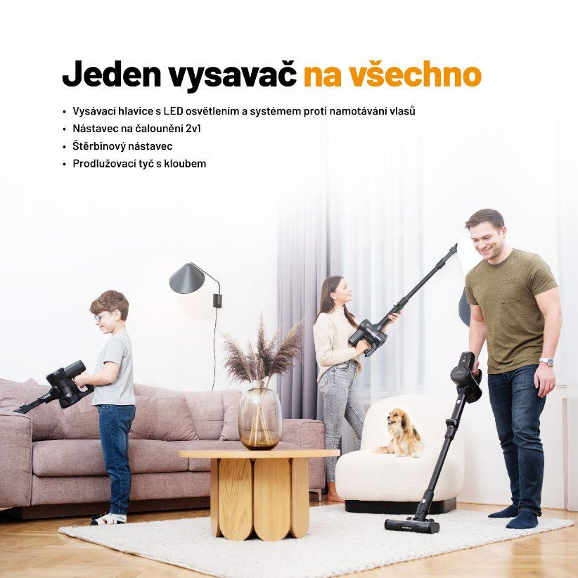 Univerzální motorizovaný kartáč se hodí pro všechny druhy podlah včetně těch, na nichž se pohybují domácí mazlíčci. Nejen jejich chlupy bezpečně odstraní hlavice se systémem proti namotávání vlasů. Úklid usnadňuje flexibilní tyč s kloubem a sběrná nádoba umístěná v horní části, vysavač tak jednoduše zajede i pod nábytek a do užších prostor. Díky provedení bez kabelu a možnosti úpravy na ruční vysavač lze přístroj využít kdekoliv, například při čištění auta. Vydrží až 35 minut na jedno nabití.