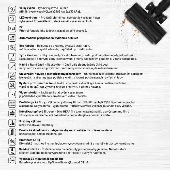 Rychlý a efektivní úklid nemusí být pouhým snem. Stačí si pořídit šikovné pomocníky. K takovým patří i Lauben Stick Vacuum 2in1 Pet Plus 400BC s vysokým sacím výkonem až 105 AW, který se automaticky přizpůsobí stupni znečištění. Nečistoty jsou ještě lépe viditelné díky LED osvětlení vysávané plochy. Umístění sběrné nádoby v horní části spolu s flexibilní tyčí s kloubem umožňuje snadné vysávání i prostor pod nábytkem či užších míst, nádobu následně zcela hygienicky vysypete. Velmi praktická je hlavice se systémem proti namotávání vlasů a zvířecích chlupů a univerzálním motorizovaným kartáčem na všechny typy podlah. Tyčový vysavač v mžiku proměníte v ruční vysavač, bezkabelové provedení poskytuje možnost využití kdekoliv. Přístroj se pyšní stylovým designem a návodný video tutoriál demonstruje správné zacházení s vysavačem.
