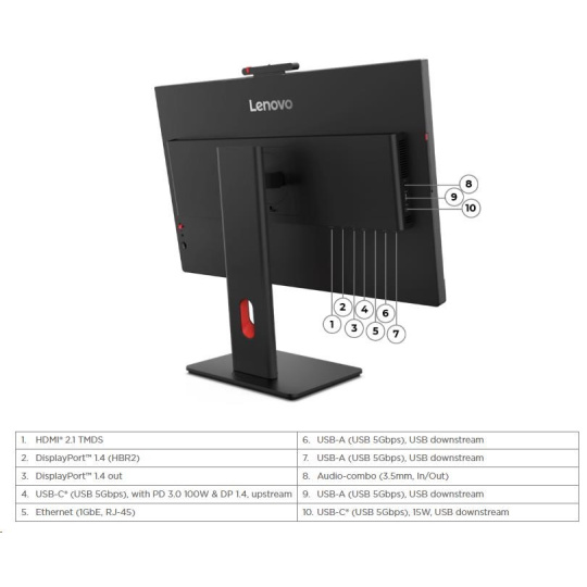 | Speciální funkce | HDR10 Compliance Lenovo ThinkColour (Lenovo Accessories and Display Manager) Support Lenovo ThinkColour podporuje Windows 10 & 11, Mac OS (funkce se liší podle systému). Lenovo Accessories and Display Manager je dřívější Lenovo Display Control Center. LDFM (Lenovo Display Fleet Manager) Zrcadlené tlačítko napájení Natural Low Blue Light Smart Power |