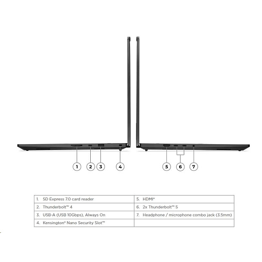 Typ zařízení:Notebook; Použití:Kancelářský; Podpora AI; Operační systém:Windows 11 Pro; Řada procesorů:Intel Core Ultra 7; Model grafické karty:NVIDIA RTX PRO 1000; Velikost paměti RAM (GB):32; Rozlišení displeje:1920x1200; Formát obrazovky:16:10; Typ disku:SSD; SSD Kapacita (GB):1000; Rozhraní:USB 3.2 Gen 2, SD karta, HDMI, 3.5mm Jack, Thunderbolt.