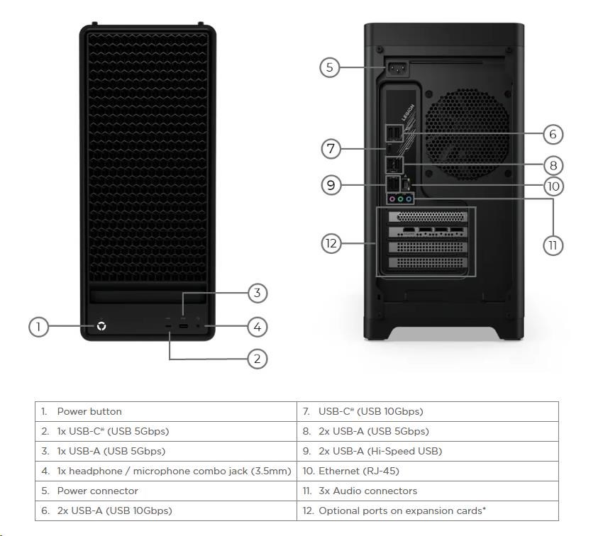 | Zadné porty | 1x USB-C® (USB 10Gbps / USB 3.2 Gen 2) 2x USB-A (Hi-Speed USB / USB 2.0) 2x USB-A (USB 10Gbps / USB 3.2 Gen 2) 2x USB-A (USB 5Gbps / USB 3.2 Gen 1) 1x Ethernet (2.5GbE RJ-45) 1x power connector 3x audio out (5.1 channel) |
