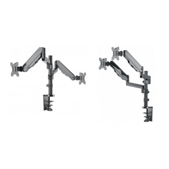 The Manhattan Universal Gas Spring Dual Monitor Mount securely supports two 17" to 32" TVs or monitors. Because it uses gas springs to hold your displays, the arms only need the lightest touch to move them to the best viewing angles for your purposes. The mount's high-quality aluminum and steel construction will provide years of reliable service. Ideal for installation on a large desk, the Manhattan Universal Gas Spring Dual Monitor Mount lets you take advantage of the extra range of movement so you can have more space to get work done.