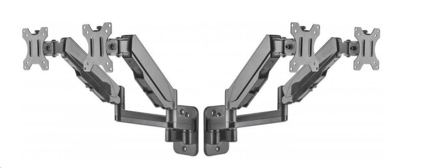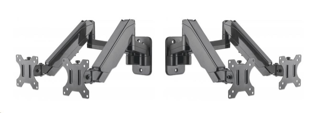 This Manhattan Universal Gas Spring Dual Monitor Wall Mount offers two jointed gas-spring arms that securely hold two 17" to 32" TV or monitors. This mount's gas springs promote easy movement of the monitors or TVs to a more comfortable viewing angle with the lightest touch. Designed to give back much needed desktop real estate and maximize productivity, the Manhattan Universal Gas Spring Dual Monitor Wall Mount provides more flexibility, reach, and overall enjoyment of whatever task is at hand.