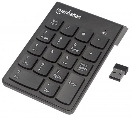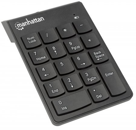 Manhattan Numeric Wireless Keypad enhances any notebook computing experience, especially when inputting important numeric data. The full-size 18-key layout and membrane (full-travel) key-switch technology reduce typing noise, improve response and provide low-profile keystrokes for fast and accurate data entry. A handy backspace key allows swift corrections. The asynchronous number-lock function allows users to simultaneously input letters from the computer's keyboard and numeric data from the keypad. Its USB Wireless Receiver connection, plug-and-play installation and ultra slim, lightweight construction make it easy to pack and travel.
