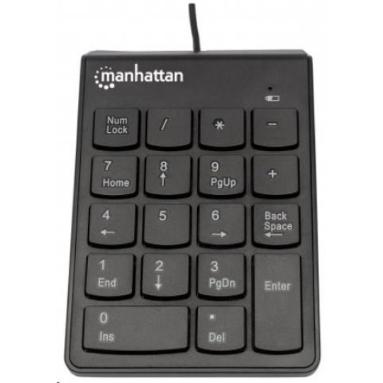 Manhattan Numeric Keypad enhances any notebook computing experiences especially when inputting important numeric data. The full-size 19-key layout and scissor-style (X-structure) key switch technology help reduce typing noise, improve response and provide low-profile keystrokes for fast and accurate data entry. A handy backspace key allows swift corrections. The asynchronous number lock function keeps its number-lock mode independent of the computer's keyboard. Users can simultaneously input letters from the computer's keyboard and input numeric data from the keypad. Its USB connection, plug-and-play installation and ultra slim, lightweight construction make it easy to pack and travel.