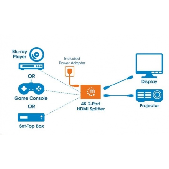 The Manhattan 4K 2-Port HDMI Splitter with built-in booster streams a 4K HDMI signal from a single UHD source to up to two UHD displays.
