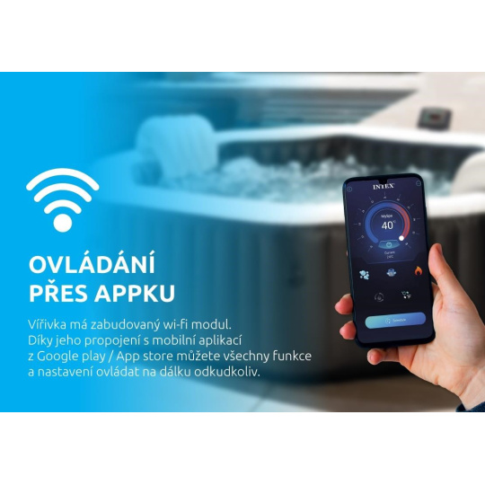 Vířivka má zabudovaný wi-fi modul, díky jeho propojení s mobilní aplikací z Google play / App store si můžete všechny funkce a nastavení ovládat na dálku odkudkoliv. Dokonalou relaxační lázeň tak stihnete připravit ještě před Vaším příchodem.