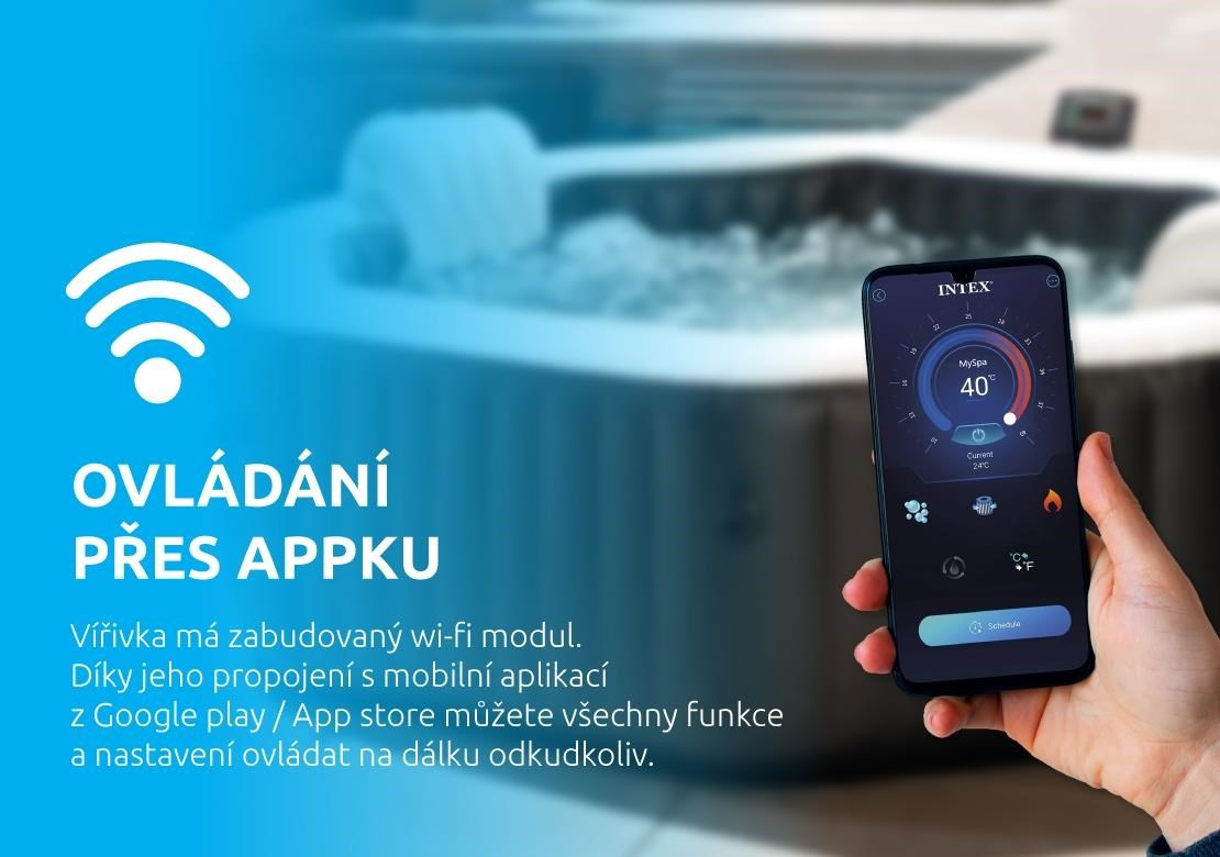 Vířivka má zabudovaný wi-fi modul, díky jeho propojení s mobilní aplikací z Google play / App store si můžete všechny funkce a nastavení ovládat na dálku odkudkoliv. Dokonalou relaxační lázeň tak stihnete připravit ještě před Vaším příchodem.