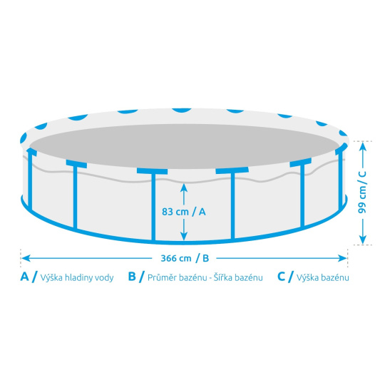 Uvedené rozměry bazénu jsou pouze orientační a ovlivnit je může rovnost podkladu či objem napuštěné vody. Povolená výrobní odchylka je 5 %.