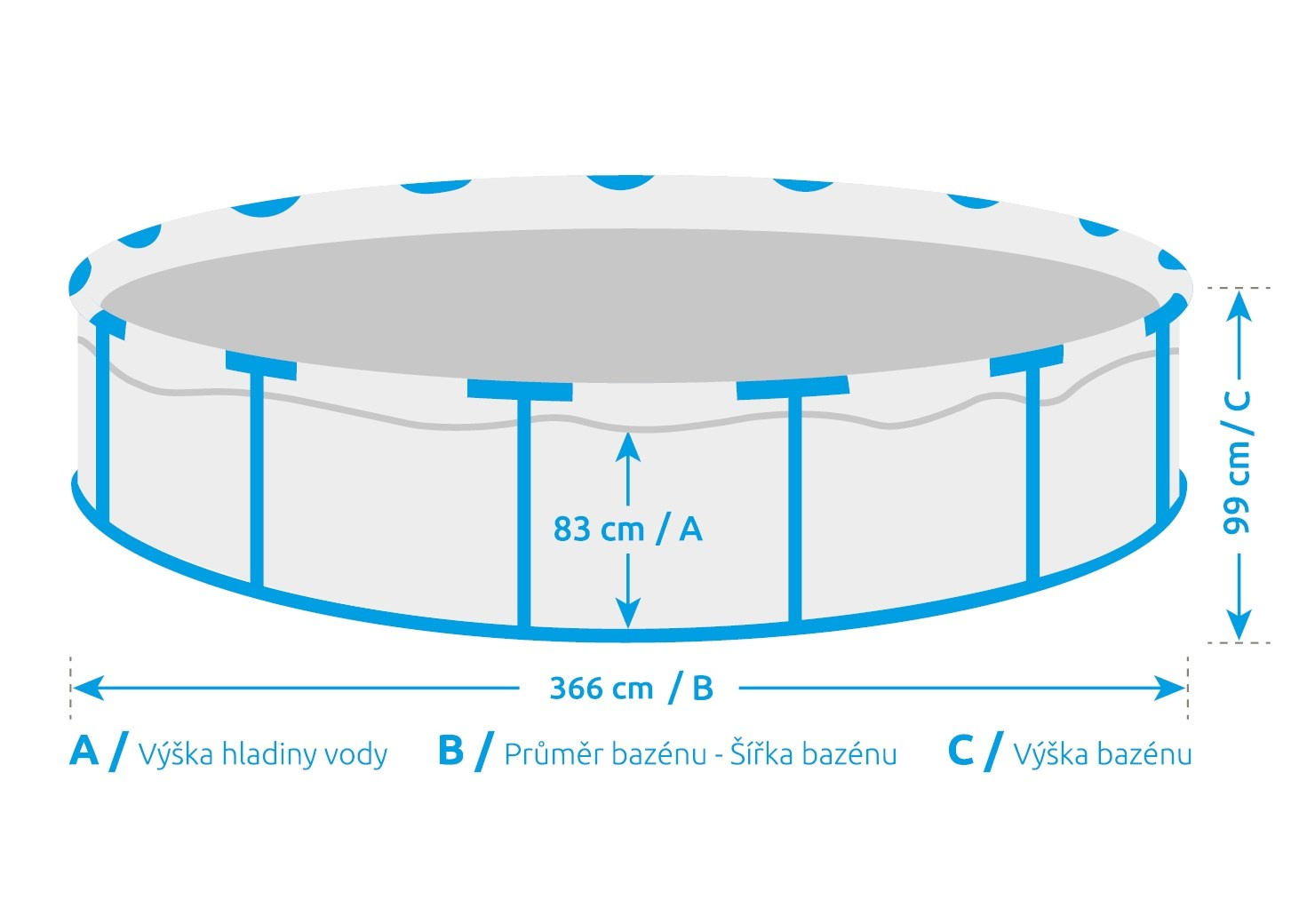 Uvedené rozměry bazénu jsou pouze orientační a ovlivnit je může rovnost podkladu či objem napuštěné vody. Povolená výrobní odchylka je 5 %.
