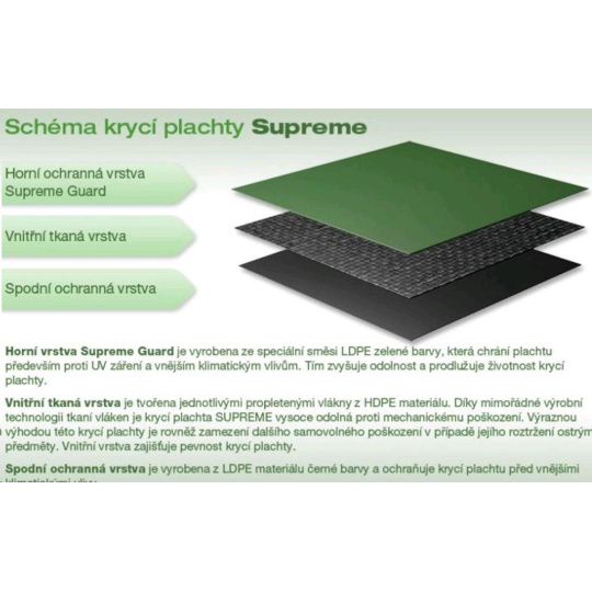 Díky použití ochranné vrstvy Supreme Guard je krycí plachta Supreme pevnější a lépe odolává povětrnostním vlivům – nejedná se ale o zimní plachtu a používání při teplotách pod bodem mrazu životnost krycí plachty snižuje.