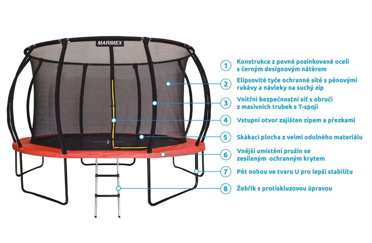 Na bezpečnostní prvky trampolín Marimex Premium je kladen velký důraz, proto jsou řazeny mezi nejbezpečnější a nejspolehlivější na českém trhu.