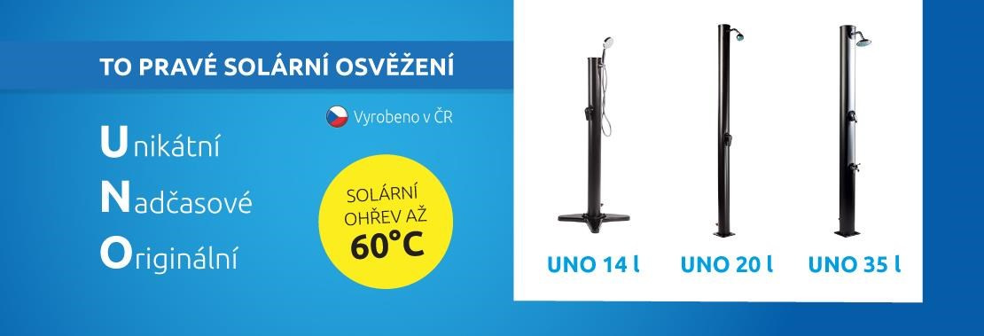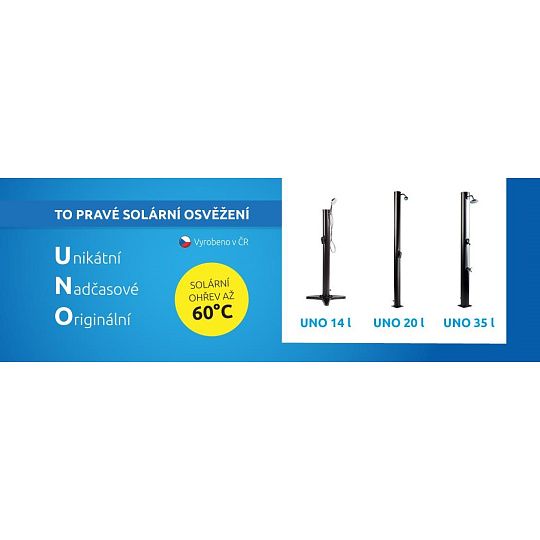 Přenosná solární sprcha UNO 14 je plastová solární sprcha se zásobníkem o objemu 14 litrů. Voda je ohřívána slunečním zářením v akumulačním zásobníku (těle). Napojení na vodovodní řád je velmi snadné, sprchu lze napojit běžnou zahradní hadicí přes hadicovou rychlospojku. Zahradní sprcha se solárním ohřevem je schopna nabídnout teplou užitkovou vodu až po dvě stě dní v roce. Vyrobená je z PP (Polypropylenu),